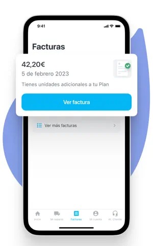 Podrás verlas o descargarlas accediendo a la pestaña Facturas desde el menú inferior de la app. En primer lugar, aparecerá tu factura más reciente, y si necesitas consultar alguna anterior, solo tienes que pulsar el botón Ver más facturas. Accediendo a cada una de ellas, podrás descargarla en formato PDF, enviarla por email, por Whatsapp o SMS.